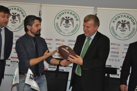 Konyaspor'un yeni iletişim sponsoru THE Mediatix'in Yönetim Kurulu Başkanı Özkan Öz tarafından günün anısına Başkan Ahmet Şan'a Amerikan futbolu topu hediye edildi.