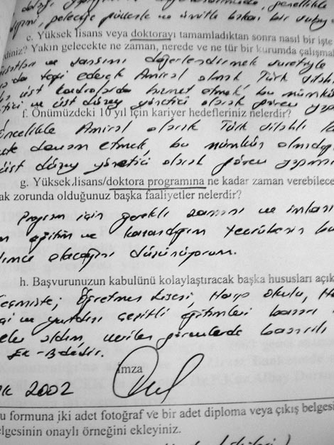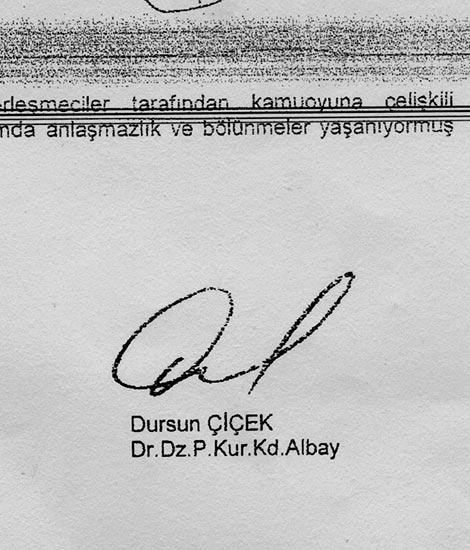Askerî savcılık, Genelkurmay Harekât Dairesi tarafından hazırlandığı iddia edilen belgedeki imzayla ilgili olarak soruşturma açarken, kamuoyu kriminal incelemenin sonucuna kilitlenmiş durumda. Zaman, tartışmalara son noktayı koyacak önemli bir belgeye ulaştı. Albay Çiçek'in, 17 Ocak 2002'de Çukurova Üniversitesi'nde doktora yapmak için müracaat ettiği sırada kullandığı imza ve el yazısını buldu.
