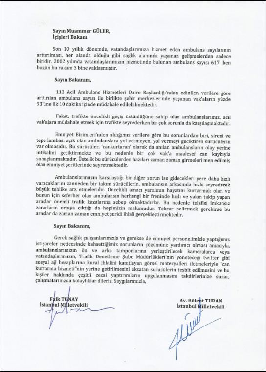 AK Parti İstanbul Milletvekili Bülent Turan ile CHP İstanbul Milletvekili Faik Tunay'ın birlikte imzaladıkları ve İçişleri Bakanı Muammer Güler'e sundukları taslak dikkatsiz sürücülerin başını yakacak. Taslağa göre ambulansların ön ve arka tamponlarına kamera yerleştirilecek ve ambulansların görevlerini engelleyen sürücüler cezai yaptırımla karşı karşıya kalacak. Ayrıca vatandaş hatalı gördüğü sürücünün fotoğrafını telefonuyla çektiği ve Twitter'da paylaştığı takdirde bu sürücülere de caza kesilecek.