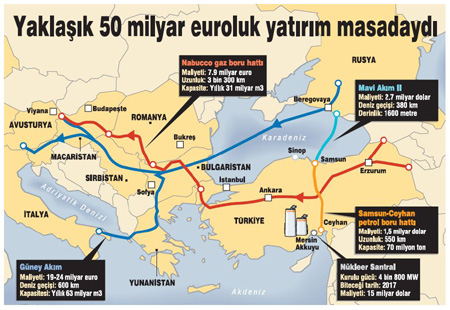 Türkiye ile Rusya, Kafkaslar-Avrupa- Ortadoğu ekseninde küresel enerji güvenliği ve barışa hizmet edecek dev projelere imza attı. Güney Akım Doğalgaz Boru Hattı, Samsun-Ceyhan Petrol Boru Hattı ile nükleer santral yapımını da içeren mega projelerdeki işbirliği Başbakan Tayyip Erdoğan ve Rusya Başbakanı Vladimir Putin'in imzasıyla perçinlendi. Tarihi işbirliğine, enerji projeleriyle yakından ilgilenen İtalyan şirketleri vesilesiyle İtalya Başbakanı Silvio Berlusconi de tanıklık etti. İki ülke arasında stratejik işbirliğini geliştiren 20 ayrı protokol de imzalandı. Putin, "Her konuda anlaştık" dedi. İki ülke arasında başbakanların başkanlığında hükümetlerarası bir mekanizma kurulması kararlaştırıldı. Başbakan Erdoğan, Putin'le görüşmesinde, enerjinin iki ülke arasındaki ekonomik ve ticari ilişkilerin en somut bileşenlerinden birini oluşturduğunu vurguladı.