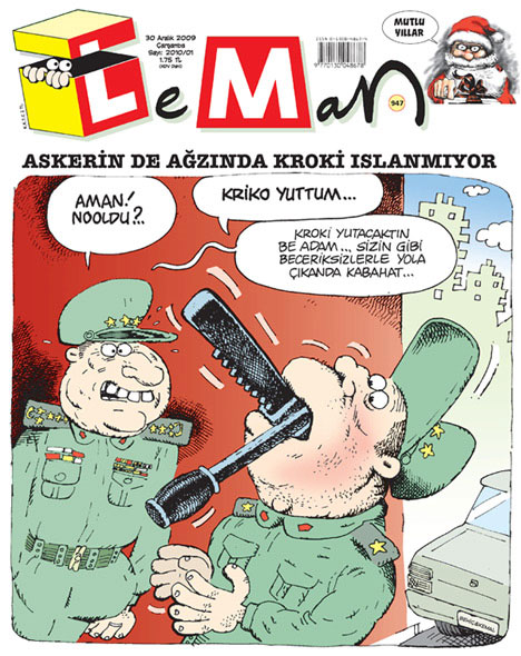 Haftalık mizah dergisi Leman bu haftaki kapağında "Askerin de ağzında kroki" ıslanmıyor başlığını seçip "kroki" yerine "kriko" yutan askeri çizdi... İşte o muhteşem karikatür...