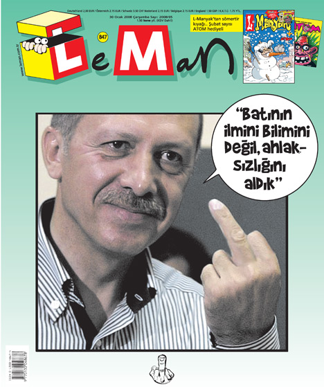Leman Dergisi yine haftaya damgasını vurdu. Çizgilerinde cinselliği sınırsızca kullanan Leman "Batının ahlaksızlığını aldık" diyen Erdoğan'a şimdi de orta parmak hareketini yaptırdı…