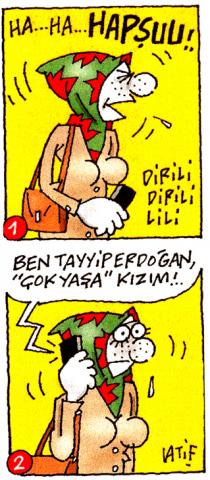Hürriyet gazetesinden Latif Demirci yaşanan başörtüsü krizinin iki kurbanı Adana'daki Tevhide ve Rize'deki Emine'yi arayarak teselli eden Başbakan Erdoğan'ı öyle bir karikatürize ettiki; bu duruma güler