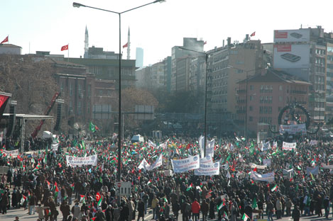 Hak-İş, Memur-Sen, MÜSİAD, Mazlumder ve AGD'nin oluşturduğu sivil toplum kuruluşları tarafından İsrail'in Gazze'ye yönelik saldırısını protesto etmek amacıyla düzenlenen miting, Sıhhiye Meydanı'nda başladı. Polis helikopterinin de alınan güvenlik önlemleri kapsamında havadan takip ettiği miting nedeniyle Atatürk Bulvarı, Mithatpaşa Caddesi ve Necatibey Caddesi trafiğe kapatıldı.