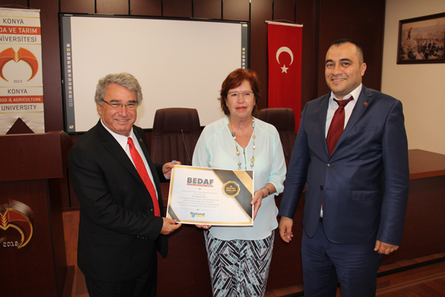 BEDAF Yetkilisi Susan Birkin, BEDAF adına Konya Gıda ve Tarım Üniversitesi adına Rektör Prof. Dr. Cumhur Çökmüş’e başarı belgesi ve Mütevelli Heyet Başkanı Dr. Mikdat Çakır’a plaket verdi.