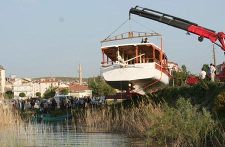 Öğretmenevi mevkiinden göl kıyılarına ulaştırılan yat, Jandarma Bot Komutanlığı'nın konuşlandığı mevkide Konya'dan özel olarak getirilen 40 ton kapasiteli iki vincin yardımıyla Beyşehir Gölü sularına yaklaşık 3 saatlik bir uğraşın ardından indirilebildi.