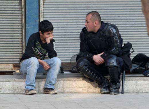 Gösteriler sırasında objektiflere yansıyan bir kare ise çok şey anlatıyordu. Kaçmaya çalışan çocuklardan birine yetişen bir polis memuru kaldırımda yanına oturduğu çocuğa, 'Bize neden taş atıyorsun?' diye sordu.