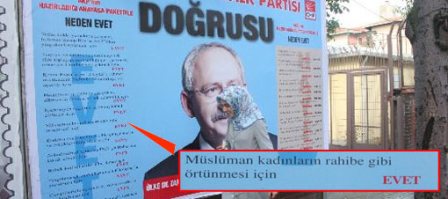 CHP'nin hazırladığı afişte çarşaflıları rahibelere benzetmesi, aslında kendi ayağına kurşun sıkmasıyla eşdeğer bir durum.. Çarşaf ve türban sorunu, bugüne dek CHP'yi pek çok kez zor durumda bıraktı. Son yerel seçimlerden önce eski genel başkan Deniz Baykal'ın İstanbul'da kara çarşaflıları il başkanlığına çağırarak CHP rozeti takması, ardından Kemal Kılıçdaroğlu'nun "Türban sorununu ben çözerim. Söz veriyorum bu sorunu çözeceğim" vaadinden sonra hazırlanan bu skandal afiş, Türkiye'nin en köklü partisinin bir kez daha güven sınavında kırık not almasına neden oldu..