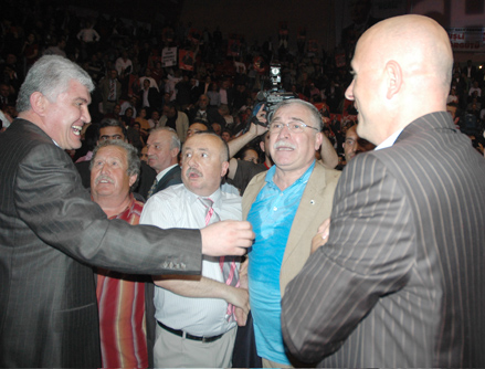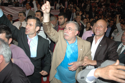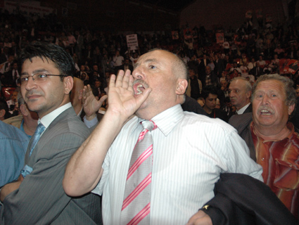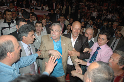 Atatürk Spor Salonu ön kapısında makam aracından inerek protokol girişine beraberindekilerle yürüyen Baykal'ı dışarda bekleyen partililer, ''İnadına Baykal, inadına sol'' sloganlarıyla karşıladılar. Baykal'ın salona girişi sırasında kalabalık nedeniyle izdiham yaşandı.