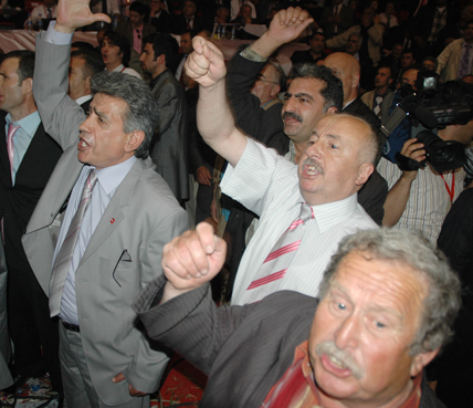 Kurultay delegeleri ve partililer, Atatürk Kapalı Spor Salonu'na sabahın erken saatlerinden itibaren gelmeye başladı. Geniş güvenlik önlemlerinin alındığı salon çevresinde partililer ve delegeler tek tek arama noktalarından geçerek içeri alınıyorlar. Kurultay salonunda genel başkan adaylarından Deniz Baykal ve Haluk Koç'u destekleyen partililer ve delegeler karşılıklı slogan atıyorlar.