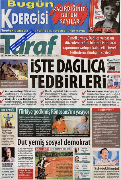 Taraf, bugün manşetten verdiği 'İşte Dağlıca Tedbirleri' başlıklı haberde, Dağlıca'da Genelkurmay'ın iddia ettiği gibi ilave önlem alınmadığını, tam tersine önlemlerin gevşetildiğini ileri sürdü.
