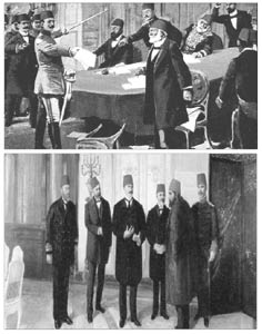 Osmanlı darbeleri tarihinde İttihat ve Terakki’nin yeri önemlidir. Soldaki tablo, 2. Abdülhamid’in tahttan indirildiğinin kendisine tebliğ edildiği anı gösteriyor; tablo, tanıkların anlatımına dayanarak son halife Abdülmecid Efendi tarafından yapıldı.