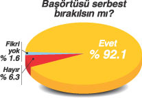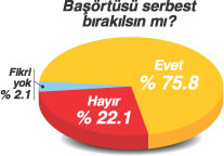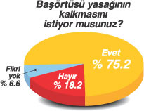 VERİTAS'IN araştırmasında, yasağın kalkmasını destekliyor musunuz' sorusuna 'evet' diyenlerin oranı 75.2, 'Hayır' diyenlerin oranı yüzde 18.2, 'fikrim yok' diyenlerin oranı ise yüzde 6.6 olarak belirlendi. Bu tabloya göre, toplumun dörtte üçü başörtüsü yasağının kaldırılmasını savunuyor. Gençlerin yasağa daha yüksek oranlarda karşı çıktıkları belirlenirken, parti tercihlerine göre CHP'lilerin üçte biri, DSP'lilerin ise yüzde 57.1'i başörtüsü yasağına tepki gösteriyor.