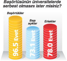 'Başörtüsünün üniversitelerde serbest olmasını ister misiniz?' sorusuna başörtülülerin yüzde 96.5'i (Evet), başı açıkların yüzde 73,1'i (Evet), erkeklerin de yüzde 78'i (Evet) yanıtını verdi.