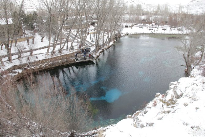 Sivas'ın Gürün ilçesinde berrak suyu ve turkuaz mavisi görünümüyle "doğal akvaryum"u andıran Gökpınar Gölü'nde balık adamlar kış aylarında da irtifa dalışı yapıyor.