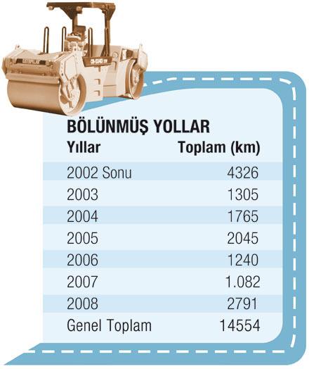 Karayolları Genel Müdürlüğü verilerine göre, 2002 yılı sonu itibarıyla 4 bin 326 kilometre bölünmüş devlet yolu ve 467 kilometre bölünmüş il yolu bulunuyordu. 2003 yılında 1.305 kilometre, 2004 yılında 1.765 km, 2005 yılında 2 bin 45 kilometre, 2006 yılında 1.240 kilometre duble yol, asfalt kaplama seviyesinde bitirilerek trafiğe açıldı. 2006 sonu itibarıyla devlet ve il yollarında toplam bölünmüş yol uzunluğu 10 bin 681 kilometreye ulaştı. 2007 yılında bin 82 kilometre duble yol inşa edilirken geçen yıl 2 bin 791 kilometre duble yol tamamlanarak ülke genelindeki duble yol uzunluğu 14 bin 554 kilometreye çıktı.