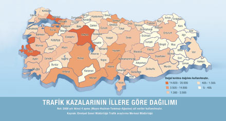 Emniyet Genel Müdürlüğü verilerine göre 2007 yılında 825 bin 583 trafik kazası meydana gelirken bu rakam geçen yıl 459 bin 941'e düştü. 2007'de 5 bin 4 kişi hayatını kaybederken, duble yol ve yol düzenlemelerinin etkisi ile bu sayı 4 bin 228 oldu. Geçen yıl ülke genelinde yaşanan kazalar oluşum şekillerine göre sıralandığında ilk sırada 26 bin 646 ile yandan çarpma ve çarpışma yer alırken, 16 bin 138 yayaya çarpma ve 12 bin 215 kaza yoldan çıkma sebebiyle meydana geldi. Kazaların 438 bin 464'ü sürücü hatasından kaynaklandı. 13 bin 81'ine yaya, 781'ine araç hatası sebep oldu. 578'i yolcu kusuru, 508'i ise yol nedeniyle meydana geldi. 70 bin 760 kişi hatalı sollama yaptı. 3 bin 781 sürücü alkollü, 3 bin 604'ü de aşırı hızlı araç kullandığı için kazaya sebep oldu.
