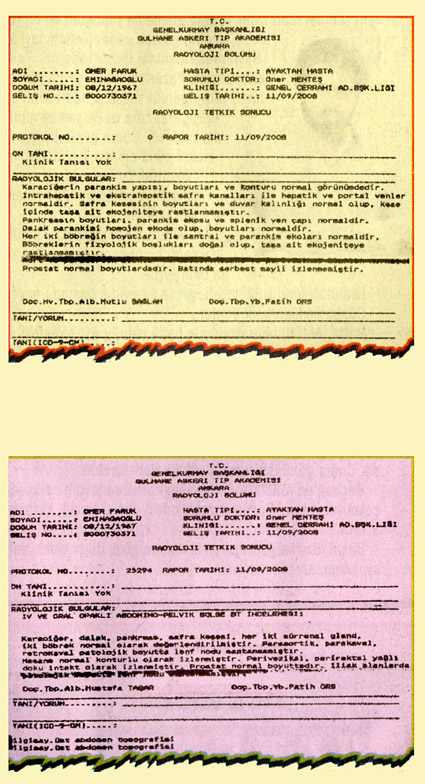 Ömer Faruk Eminağaoğlu’nun 11 Eylül 2008’de GATA’da yapılan tetkik sonuçları Vakit'e ulaştı. Kan tahlilleri, abdominal bilgisayarlı tomografi ve radyoloji tetkiklerinde Eminağaoğlu’nun 1984 yılındaki ameliyat raporunda ifade edilen hastalıklarına dair hiçbir belirtiye rastlanmadı. Radoloji Bölümü’nce hazırlanan abdominal bilgisayarlı tomografi raporuna göre Eminağaoğlu’na damardan ve ağızdan verilen radyo-opak maddeden sonra yapılan görüntülemede; karın bölgesinde bulunan organların hepsinin normal olduğu, bağırsaklarında yapışıklığa dair herhangi bir bulguya rastlanmadığı, karın bölgesinde hastalık işareti sayılabilecek hiçbir belirtinin olmadığı anlaşıldı. Savcının karın içindeki lenf bezlerinin de normal durumda olduğu tespit edildi. Çekilen ultrason neticesinde de aynı sonuca ulaşıldı, yani hastalık işareti sayılabilecek herhangi bir bulguya rastlanmadı. GATA’daki tetkikler esnasında süreci takip eden doktorlar tarafından doldurulan ‘Radyoloji Tetkik İstek Belgesi’nin “tanı” hanesinde herhangi bir ifadenin yer almaması da dikkat çekici bulundu.
