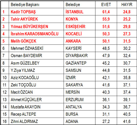 Andy-Ar’ın yaptığı ankette en başarılı belediye başkanı İstanbul Büyükşehir Belediye Başkanı Kadir Topbaş oldu. Onu Konya Büyükşehir Belediye Başkanı Tahir Akyürek, Eskişehir Belediye Başkanı Yılmaz Büyükerşen, Kocaeli Belediye Başkanı İbrahim Karaosmanoğlu ve Ankara Büyükşehir Belediye Başkanı Melih Gökçek geldi.