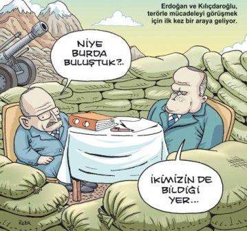 Ancak Penguen dergisi, iki lider arasında daha önce yaşanan "siper polemiği"ne de bir gönderme yaparak iki lideri kum torbalarıyla dolu bir siperde buluşturdu..