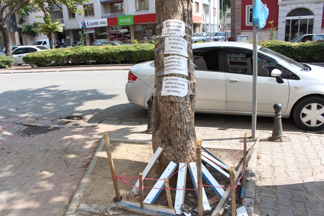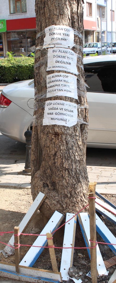 Çöp dökülmemesi için abartıdan kaçılmayan ağacın altında 4 adet afiş yapıştırılmış. Yanındaki telefon trafosuna da uyarı yazısının asıldığı yerde ağacın altına da çıtalar çakılarak çöp dökülmesi engellenmek istenmiş. Israrlı bir şekilde çöp dökülmemesi konusunda uyaran yazılarda ise “Bu alan çöp dökme yeri değildir, Ey İnsanoğlu. Bu alana çöp bırakmak kul hakkına girer Allah’tan kork. Çöp dökme yerleri sağda ve solda, görmüyor musun!” uyarılar bulunuyor. Sultanşah caddesindeki ağacın altına çöp dökülmemesi yönünde ellerinden geldiğini yaptıklarını söyleyen çevre esnafı bunun önüne geçmenin birçok yolunu denediklerini söyledi. Tüm uğraşlarına rağmen yine de buraya çöp dökülmesini engelleyemeyen esnaflar ve apartman sakinleri bu yazıları yazarak engellemeyi başardılar. Servet R. Çolak – Memleket