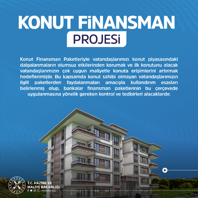 Konut Finansman Paketleriyle vatandaşlarımızı konut piyasasındaki dalgalanmaların olumsuz etkilerinden korumak ve ilk konutunu alacak vatandaşlarımızın çok uygun maliyetle konuta erişimlerini sağlamak hedeflenmiştir. Bu kapsamda konut sahibi olmayan vatandaşlarımızın ilgili paketlerden faydalanmaları amacıyla kullandırım esasları belirlenmiş olup, bankalar finansman paketlerinin bu çerçevede uygulanmasına yönelik gereken kontrol ve tedbirleri alacaklardır.