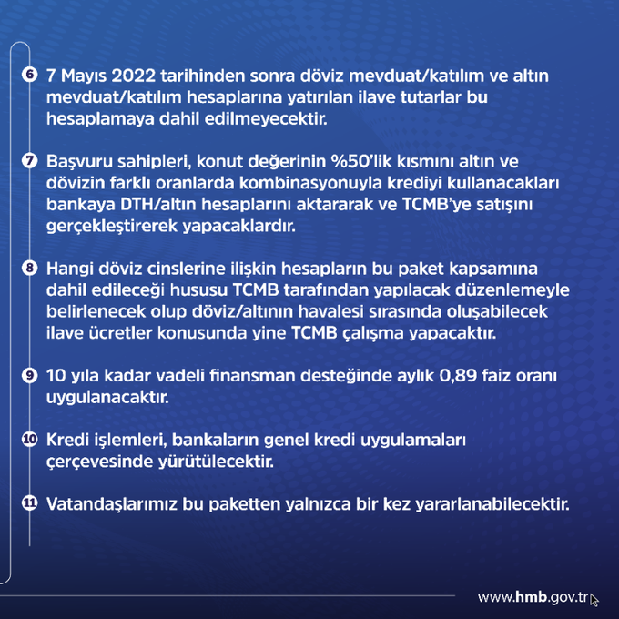Başvuru sahipleri, konut değerinin yüzde 50'lik kısmını altın ve dövizin farklı oranlarda kombinasyonuyla krediyi kullanacakları bankaya, DTH (döviz tevdiat hesabı)/altın hesaplarına aktararak ve TCMB'ye satışını gerçekleştirerek yapabileceklerdir.