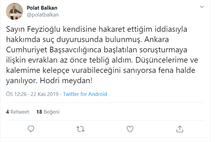 "Sayın Feyzioğlu kendisine hakaret ettiğim iddiasıyla hakkımda suç duyurusunda bulunmuş. Ankara Cumhuriyet Başsavcılığınca başlatılan soruşturmaya ilişkin evrakları az önce tebliğ aldım. Düşüncelerime ve kalemime kelepçe vurabileceğini sanıyorsa fena halde yanılıyor. Hodri meydan!"