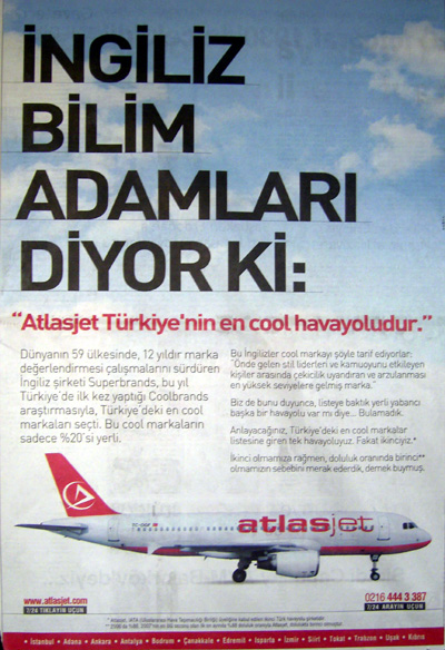 Atlas Jet'in dün gece Isparta'da düşen ve 56 kişinin hayatına mal olan uçağı Türkiye'yi yasa boğdu. Türkiye, güne ölüm haberiyle başlarken, gazetelerdeki 'ilginç tesadüf' ise gözlerden kaçmadı. Bu tesadüf, Türkiye'nin önemli gazetelerinde tam sayfa yer alan "Atlas Jet" reklamıydı. "Atlas, Türkiye'nin en cool havayoludur" ibaresiyle TAM SAYFA verilen ilanlar, Milliyet'in iç, Akşam ve Sabah'ın ise arka kapağında da yer aldı.