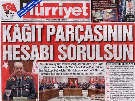 Hürriyet; 'KAĞIT PARÇASININ HESABI SORULSUN', manşetiyle Başbuğ'a desteğini cömertce vurgularken,