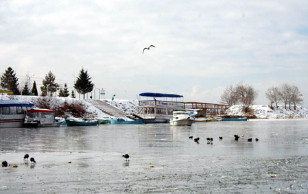 Öte yandan, donan Beyşehir Gölü'nün kıyıları da sevgililerin romantik dakikalar yaşadığı bir mekan haline dönüştü. Donan göl kıyılarını izlemeye gelen sevgililer, yürüyüş yaparak tahta köprü üzerinden geçtikleri mini Aşk Adası'nda vakit geçiriyor.