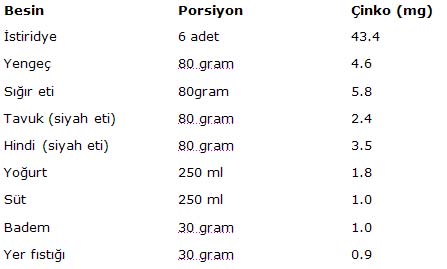 Çinko en çok et ve deniz ürünlerinde bulunur. Çinko açısından en zengin besin maddesi istiridyedir. Buna karşılık gebelikte çiğ istiridye ve diğer deniz kabuklularının tüketilmesi tavsiye edilmez.