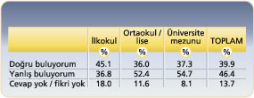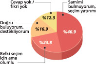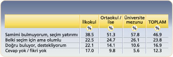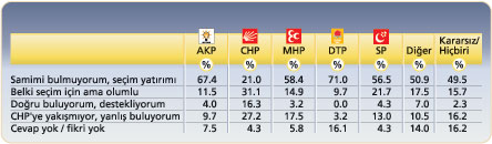 KATILIMCILARA, “AKP’nin Alevi açılımını nasıl değerlendiriyorsunuz?” diye soruldu. Katılımcıların yüzde 46.9’u, Alevi açılımının “seçim yatırımı” olduğunu söylerken, yüzde 23.8’i “belki seçim yatırımı ancak yine de olumlu bir gelişme” dedi. “Destek verip, doğru bulduğunu” söyleyenlerin oranı ise yüzde 16.9 oldu. Eğitim yükseldikçe “Seçim yatırımı” diyenlerin oranı da yükseldi. Alevilerle ilgili girişimleri samimi bulmayanların yüzde 57.8’inin üniversite mezunu olması dikkat çekti. Konuyu partiler bazında da değerlendiren araştırmaya göre, AKP seçmeninin yüzde 35.9’u “Doğru buluyor ve destekliyorum” derken, CHP seçmeninin yüzde 74.7’si “Seçim yatırımı” görüşünde.