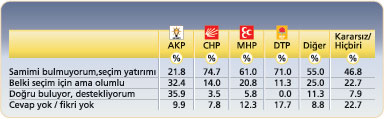 Milliyet'in yayınladığı A&G araştırma şirketinin Adil Gür yönetiminde 33 ilde yaptığı araştırma, kamuoyunun büyük bölümünün AKP’nin Alevi ve CHP’nin çarşaf açılımlarını samimi bulmayıp “seçim yatırımı” olarak gördüğünü ortaya koydu