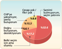 SEÇMEN nüfusun yüzde 52.6’sı, CHP’nin çarşaf açılımını samimi bulmadığını, tamamen seçim yatırımı olduğunu söylerken, yüzde 17.2’si ise, “Belki seçim yatırımı ama olumlu bir gelişme” yorumunda bulundu. “Doğru buluyorum, destekliyorum” diyenlerin oranı yüzde 6.1’de kalırken, “CHP’ye yakışmıyor, yanlış buluyorum” diyenlerin oranı yüzde 15.3 oldu. Eğitim seviyesi yükseldikçe, “belki seçim yatırımı ama olumlu bir gelişme” diyenlerin oranı arttı.