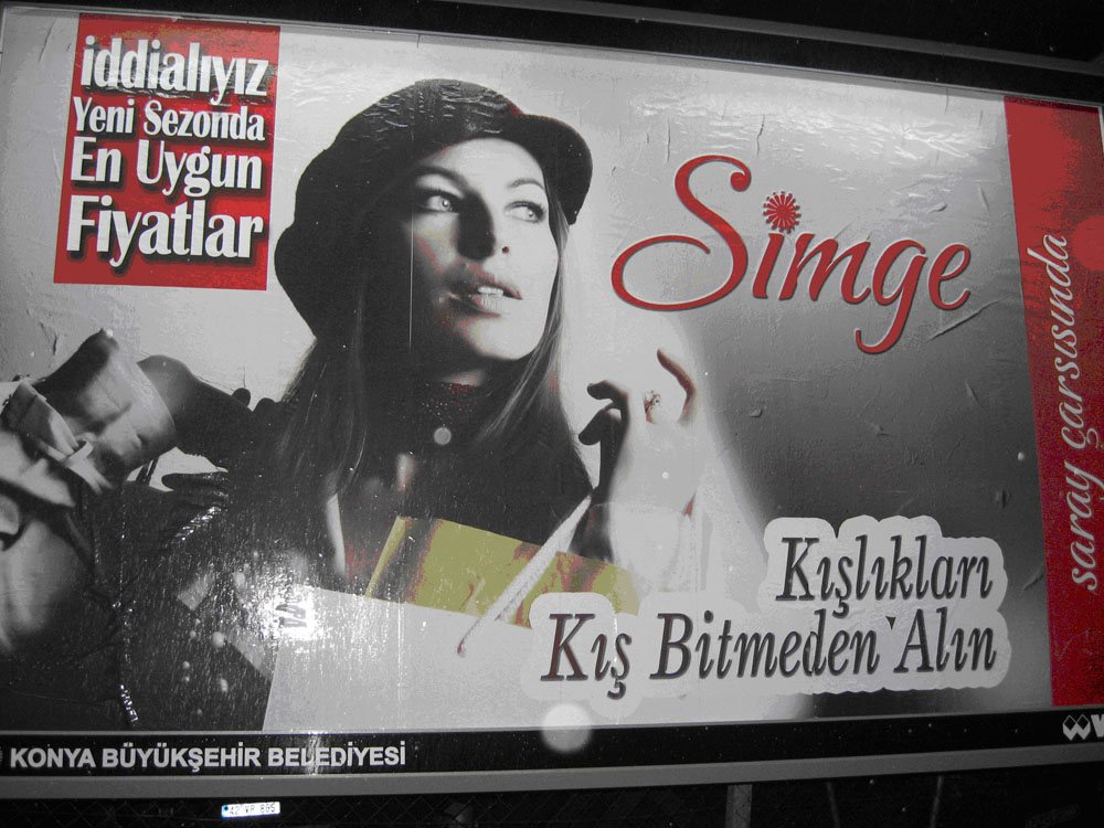 Açıkhavada yine kendini rakiplerden önce öldüren reklamı görüyoruz. Simge isimli firma bayan kışlıkları atıyor anlaşılan. (Nerede olduğunu anlamayalım diye dikey yazmış. Ben yardımcı olayım. Saray Çarşısındaymış.) Bu bayan manken nasıl bir ürün olduğunu gösteriyor? Simge’nin kaliteli bayan ürünleri sattığını gösteriyor. Hem bu bayan görselini kullanacaksın sonra “Kışlıkları kış bitmeden alın” diyerek seyyar satıcı oluvereceksin. (Kışlıklar kalmadı gel vatandaş gel kışlıkları kış bitmeden al. Kalmadı, valla hanım abla kaçırma haa…) Olmamış! Sanki bu sloganı rakipler yazmış gibi. Rakip ancak senin böyle kötü reklam yapmanı isteyebilir. Ama rakipten önce sen yapmışsın kendine bu kötülüğü. Mankenin üstündeki hangi kışlık bitiyor ki! Onu hemen bitmeden aldırtmaya çalışıyorsunuz! Üstüne bir de “İddialıyız Yeni Sezonda En Uygun Fiyatlar” mesajlarını yazmışsınız. Niye sıkışık font kullandınız? Okunmasın diye mi? Keşke okunmasın diye yazmasaydınız. Reklam yapan firma zaten iddialı olduğu için reklam yapar. İddiasız adam reklamı bilmez ki. “İddialıyız” diye niye yazarsınız ki. Yeni sezonda en uygun fiyatlar neyi ifade ediyor. Kime göre uygun fiyat. İmaj mı! yapıyorsunuz, promosyon mu! yapacaksınız, isminizi bilinir mi! kılmaya çalışıyorsunuz, kışlıkçı! olduğunuzu mu söylemeye çalışıyorsunuz hiç anlaşılmıyor. Rakibinin yapamadığını sen kendine yapmışsın Simge. Yazık olmuş.