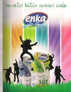Dergi nasıl bir mecradır. Dergi itibar mecrasıdır. İmaj mecrasıdır. Kendini tazeleme mecrasıdır. Hele hele renkli ürünseniz kesinlikle kullanmanız gereken bir mecradır. Böyle bir stratejiyle yapılmış reklamlara bir bakalım. Geçen haftadan bildiğimiz Enka Süt bu reklamında “hayatın bütün renkleri onda” başlıklı bir imaj reklamı yapmış. Geçen haftadan söylediğim gibi konumlandırma sorunu devam ediyor. Ne diyor hiç anlamadığım bir firma Enka Süt. Doğal mıdır, renkli midir, değer mi verir, çocuk için mi üretilir, hiç anlamadım. Rakiplerin yapamadığını kendisi yapıyor. İnsanların kafasını karıştırıyor. Enka Süt’te hangi renkleri buldunuz siz cevaplayın! Renkli süt mü satıyor ki!