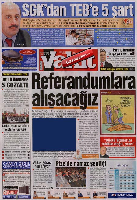 Hürriyet gazetesi bugün Başbakan Erdoğan'ın, Moskova'ya yaptığı "Çalışma ziyareti"nden dönüş sırasında uçakta yaptığı açıklamaları manşete çıkardı.. Erdoğan'ın "referanduma alışmalıyız" sözlerini manşete çeken gazetenin en büyük talihsizliği ise bugün Vakit gazetesiyle pişti olmasıydı. Vakit gazetesi de bugün aynı manşetle çıktı. Hatta bir çok yandaş gazete habere geniş yer ayırdı.. Erdoğan'ın sözlerini Yeni Şafak sürmanşetten, Bugün ise manşetten verdi.