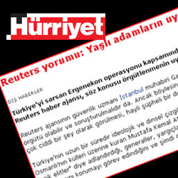 Hürriyet ve CNN Türk, Reuters'a konuşan bir yorumcunun söylediklerini 'Reuters'ın muhabiri söylemiş gibi' vermeyi tercih ederken, Ergenekon konusunda ısrarlı hedef saptırdığı yönündeki iddialara bir yenisini daha eklemiş oldu. Hürriyet, Reuters'in haberini okuyucularına "Yaşlı adamların uyduruk örgütü" başlığıyla duyurmuştu.