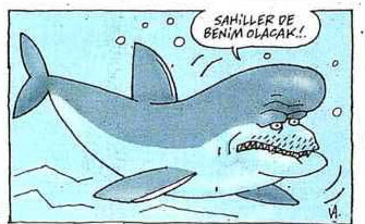 Ak Parti’nin sahillerdeki oy oranına gönderme yapılan karikatürde Başbakan Erdoğan bir köpek balığına benzetilmiş. Her fırsatta sahil kesimlerindeki oy oranını arttırmak istediğini dile getiren Erdoğan ‘Sahiller de benim olacak’ sözleriyle karikatürize edilmiş.