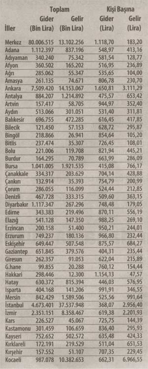 Türkiye çapında toplanan her 100 liranın yaklaşık 37 lirasını tek başına karşılayan istanbul, kişi başına kamu harcamaları bakımından ise tam bir 'bütçe fukarası' görünümünde. Devlete kişi basma 2956 lira 40 kuruş katkı sağlayan İstanbul için, devletin kişi başına yaptığı harcama ise 368 lira 7 kuruşta kalıyor.