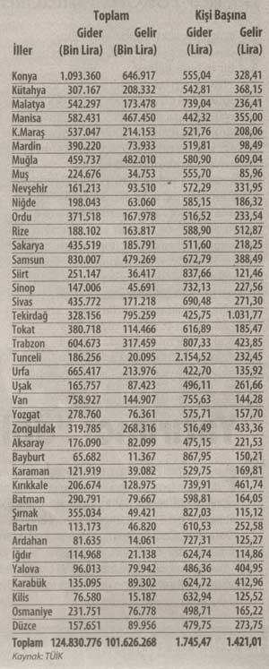 İl il gelir gider karnesi