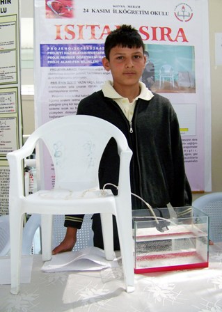Meram 24 Kasım İlköğretim Okulu 8-A sınıfı öğrencisi Mustafa Eşme, "Yazın Yaşa Kışın Taşa Oturma" atasözünden yola çıkarak ısıtan sıra projesini geliştirdiğini ifade etti. Okul kaloriferi sisteminden yararlanarak öğrenci sırasını ısıtmak istediğini söyleyen 13 yaşındaki Mustafa Eşme, "Öğrencilerin soğuk sıraya oturmasından dolayı meydana gelebilecek hastalıklara engel olmak ve ders motivasyonunu artırmak için böyle bir şey düşündüm. Isıtan sıra projesi ile okul kalorifer sisteminden yararlanarak öğrenci sırasını ısıtmayı amaçlıyorum. Kalorifer peteğinin çıkış kör tapasına bir termometreli vana yardımıyla sisteme sıcak su bağlantısı yapılıyor. Aynı şekilde yüzeyden dolaşan su peteğin soğuk su dönüşüne bağlanarak suyun devir daimini sağlıyor. Bu projeyle öğrencilerin sabah erken saatlerde okula geldiğinde ve özellikle kışın sert geçen yerlerde soğuk sırayı ısıtıp soğuktan gelecek hastalıklara engel olması ve ders motivasyonunu arttırmasını amaçladım" dedi.