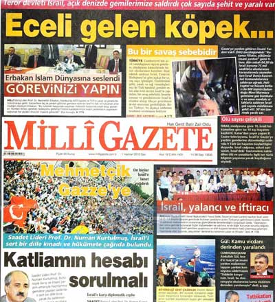 "ECELİ GELEN KÖPEK..." sözü ile manşet atıldı. Haberin spotunda ise; "Terör devleti İsrail açık denizde gemilerimize saldırdı, çok sayıda şehit ve yaralı var" denildi. Milli Gazete'de "BU BİR SAVAŞ SEBEBİDİR" başlığının yanı sıra Erbakan'ın yaptığı "GÖREVİNİZİ YAPIN" çağrısı dikkat çekiyor...
