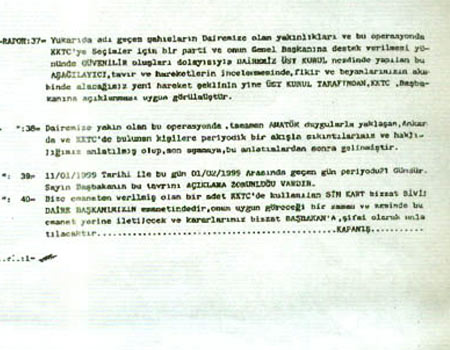Belgeler, seçimler öncesinde Türkiye’den Kıbrıs’a giden ölüm timinin Türkiye’ye dönüşü de yer alıyor. Raporlarda, ‘KKTC’de şu an 24 saat gibi bir zaman diliminde yapabildiğimiz ve ulaştığımız noktalar memnuniyet vericidir... Bu bültenin hazırlandığı saat ve zaman diliminden sonra KKTC’de hiç bir elemanımız kalmamıştır. 18.4.1999 Türkiye Genel Seçimleri için organizasyona giren dairemizin buradan en üst başarı ile ayrılacağından ‘Üst Kurulun’ en küçük bir şüphesi yoktur’ deniliyor.