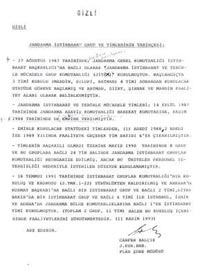 "27 Ağustos 1987 tarihinde Jandarma Genel Komutanlığı İstihbarat Başkanlığı'na bağlı olarak Jandarma İstihbarat ve Terörle Mücadele Grup Komutanlığı (JİTEM) kurulmuştur. Başlangıçta üç timi kurulu, (Mardin, Silopi, Batman) dört timi sonradan kurulacak statüde göreve başlamış ve Batman, Siirt, Şırnak ve Mardin faaliyet alanı olarak belirlenmiştir. Jandarma İstihbarat ve Terörle Mücadele timleri 14 Eylül 1987 tarihinde Jandarma Asayiş Komutanlığı Harekât Komutası'na, Kasım 1988'de de emrine verilmiştir. Emirle kurulacak statüdeki timlerden bir adedi 1988, iki adedi ise 1989 yılında faaliyete geçerek tim sayısı altıya çıkarılmıştır. Timlerin başarılı olması üzerine Mayıs 1990 tarihinde 78 grup ve bu gruplara bağlı 24 tim halinde Jandarma İstihbarat Gruplar Komutanlığı reorganize edilmiş, ancak bu üniteler personel yetersizliği nedeniyle istenilen düzeyde kurulamamıştır. 18 Temmuz 1991 tarihinde İstihbarat Gruplar Komutalığı'nın kuruluş ve kadrosu (J.T.M.K.1-22) yürürlükten kaldırılmış ve Ankara'da Kurmay Başkanı'na bağlı bir istihbarat grup ve bağlı iki timi, Diyarbakır'da bir istihbarat grup ve bağlı altı tim ile İstanbul, İzmir ve Adana'da jandarma bölge komutanlıklarına bağlı birer istihbarat timi kurulmuştur. Toplam iki grup, on bir tim halen bu kuruluş içerisinde faaliyetlerini sürdürmektedir."