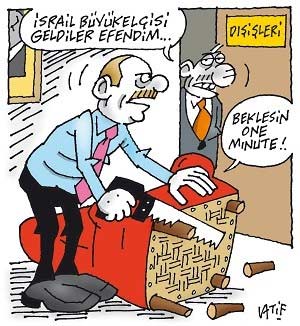 İsrail Dışişleri Bakan Yardımcısı Ayalon'un Türk Büyükelçisi Oğuç Çelikkol'a yönelik alçak koltuk küstahlığı karikatürlerin usta çizerlerine de ilham kaynağı oldu.