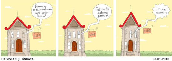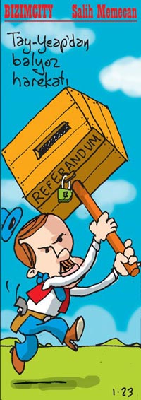 Ve tabii Salih Memecan. Her türlü olayı müthiş bir zeka pırıltısıyla çizgilere taşıyan Memecan bu kez Başbakan'ı, elinde sandık şeklinde bir balyozla çizmiş. Sandığın üstünde ise referandum yazıyor. Memecan sivil ve demokratik bir anayasa yapılana kadar bu tarz darbe planlarının çıkmaya devam edeceğini anlatmak ister gibi