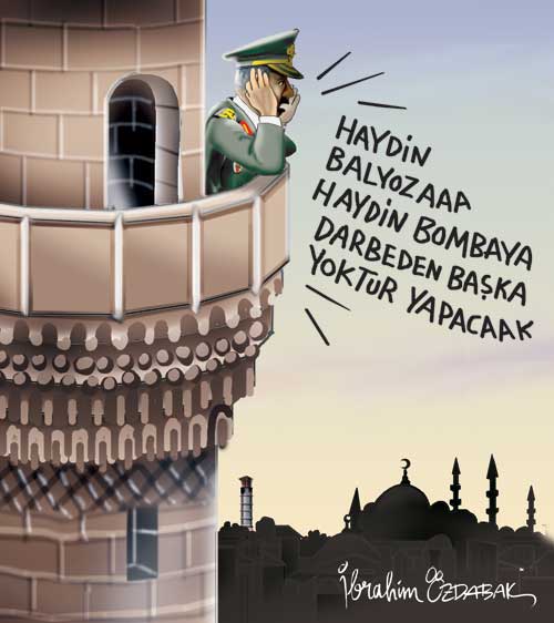 Balyoz planındaki safhaların en dikkat çekici olanı, darbe sonrası ezanın Türkçe okunması üzerine yapılan hazırlık. Karikatürist kalemini o kadar maharetle kullanmış ki; herşeyi çizgilerden anlamak mümkün...