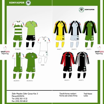Süper Lig takımlarının 2010-2011 sezonunda giyeceği formaların tanıtıldığı katalog TFF tarafından tanıtılırken, Konyaspor’un yeni sezonda son yıllarda görmeye alaşık olduğumuz forma tasarımlarıyla mücadele edeceği gözlendi. İç sahadaki 1 numaralı tercihi Celtic tipi yatay çizgili forma olan Konyaspor’un evindeki diğer tercihi ise fıstık yeşili forma ve siyah şorttan oluşan takım olacak. Deplasmanda kalın parçalı yeşil-beyaz forma ve düz yeşil forma tercihinde bulunan temsilcimiz yedek forma olarak da düz beyaz formayı TFF’ye bildirdi.